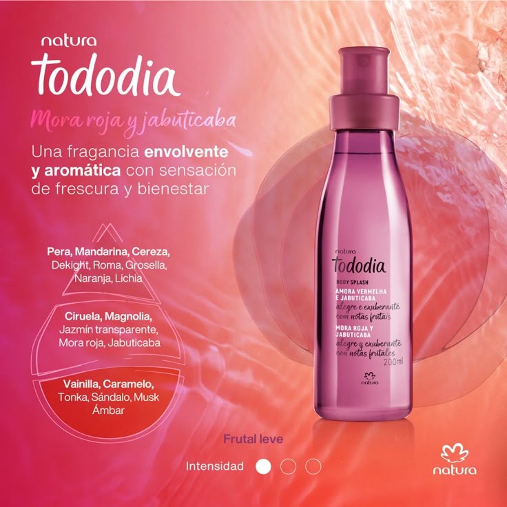 Despierta tus sentidos con la fragancia de mora roja y jabuticaba. Una fragancia envolvente y aromática con sensación de frescura y bienestar.