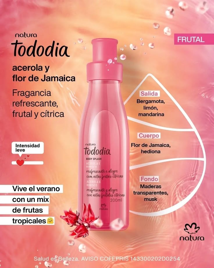 Despierta tus sentidos con la fragancia de acerola e hibisco. Fragancia refrescante, frutal y cítrica.
